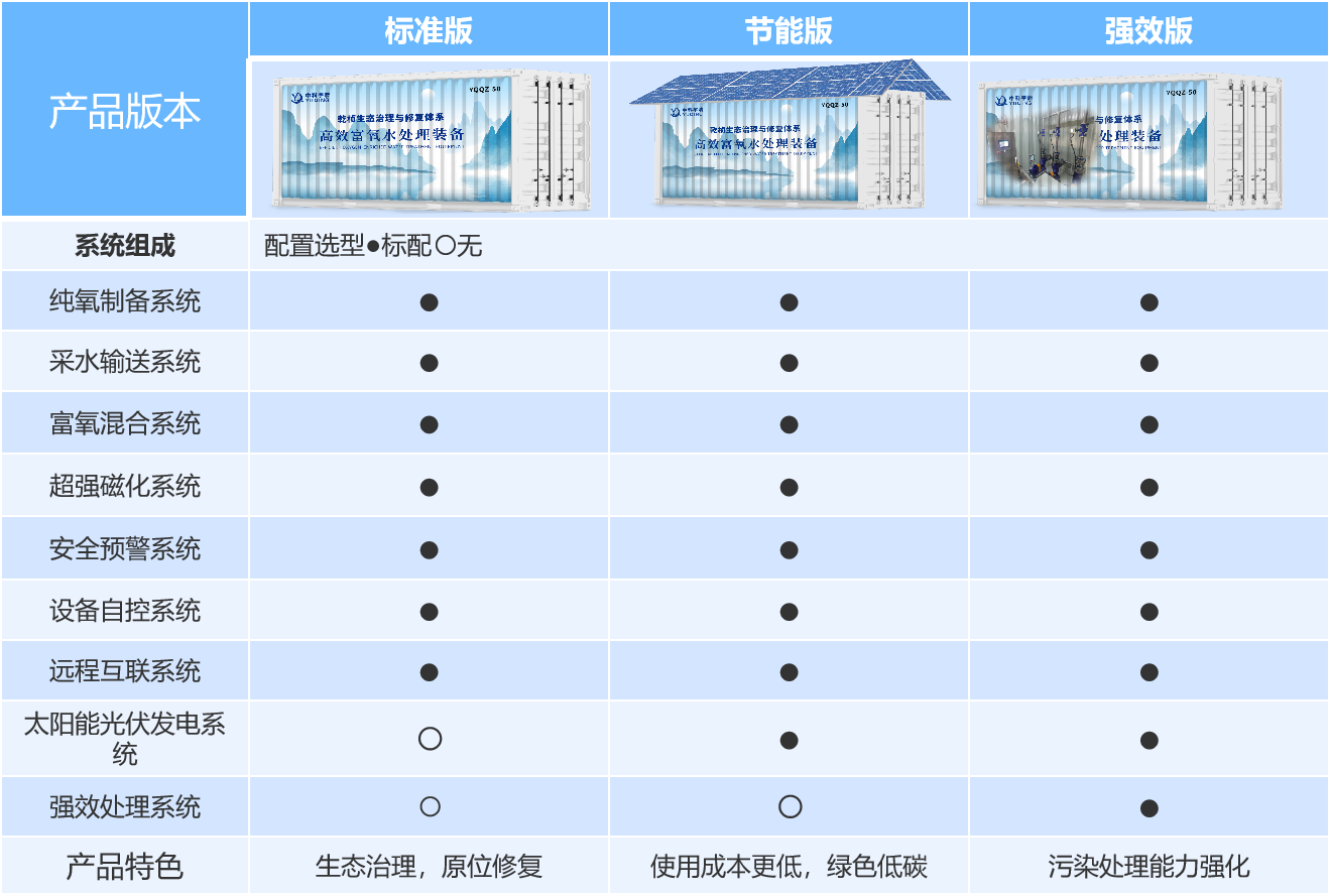 ✦ 强效版:在节能版产品基础上耦合其他工艺,进一步强化高效富氧水处理装备对水中某个或多个污染因子处理能力。
