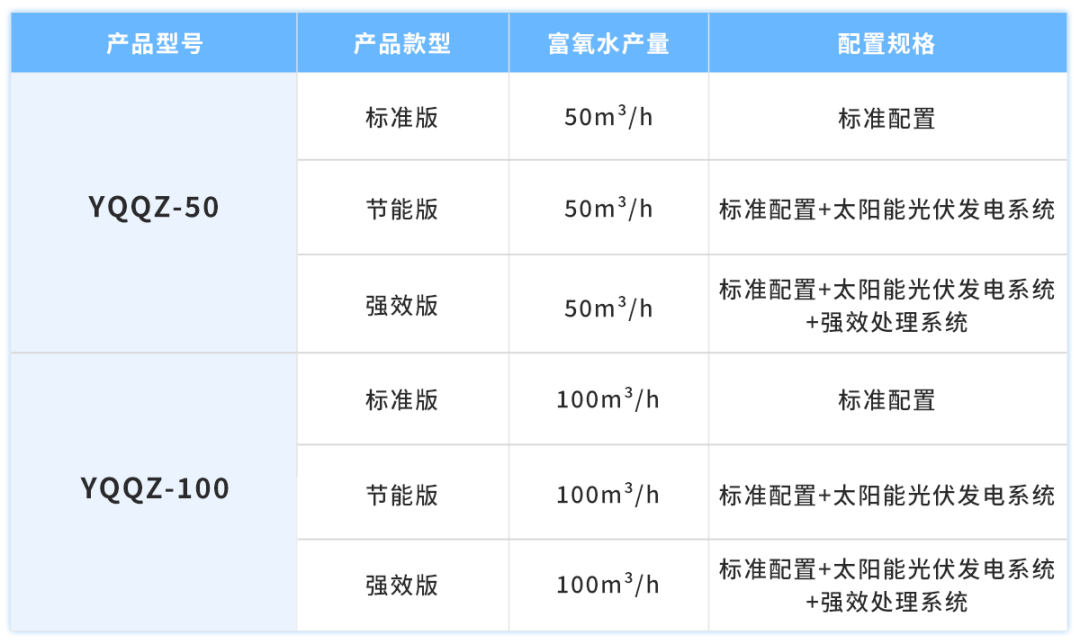 现在产品分为标准版、节能版、强效版。其中,标准版中的标准配置包括:纯氧制备系统、采水输送系统、富氧混合系统、超强磁化系统、安全预警系统、设备自控系统、远程互联系统。